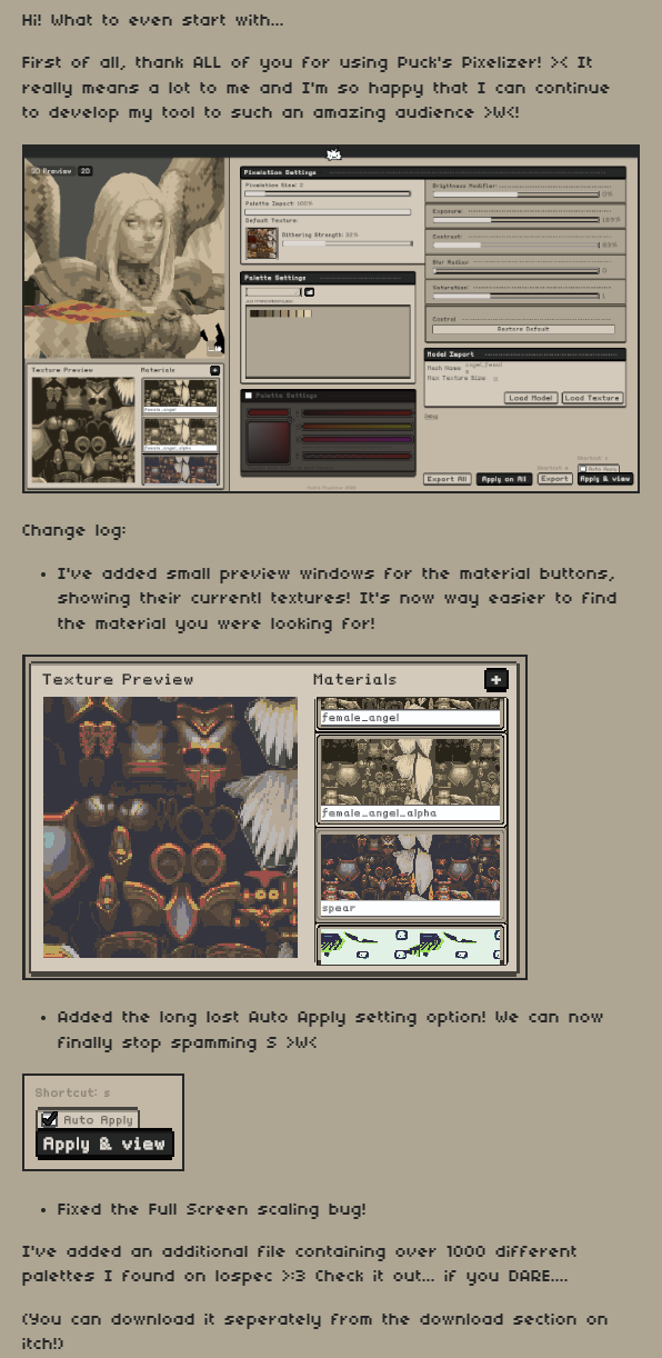 Hey Puck! Just wanted to thank you for the hard work you put into this program. Really helpful for getting quality conversions and previews for demakes and low poly/pixel art enthusiasts. Also, before I forget, Happy Birthday! Have a cake on me, hope you have a great one!🎂😁